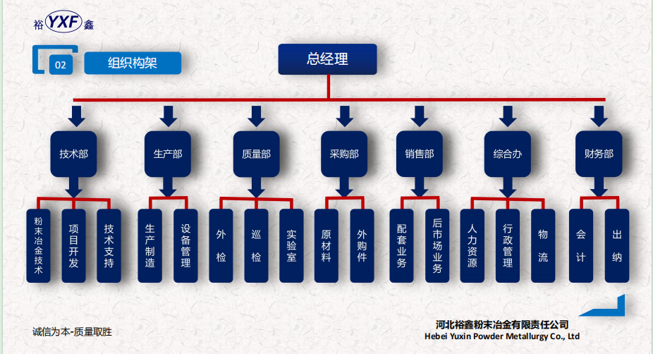 河北裕鑫粉末冶金有限责任公司构建了权责清晰、协同高效的现代化组织管理体系,以总经理为核心统筹全局,下设技术部、生产部、质量部、采购部、销售部、综合办、财务部七大核心职能部门,各部门分工明确、深度协同,形成从研发、生产、品控到采购、销售、后勤保障的全流程闭环管理,为公司高质量发展与客户价值实现提供坚实的组织保障。